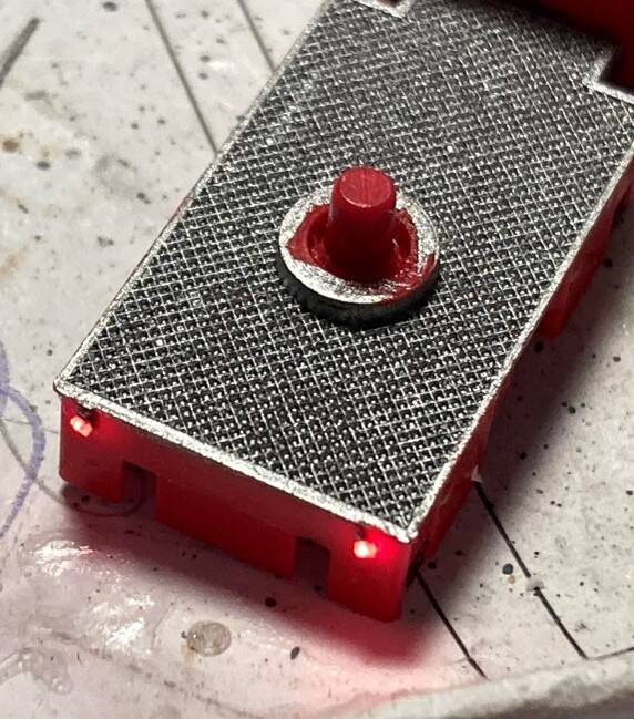 Hugo heeft de brandweerwagen uit elkaar gehaald en de leds met secondengel onder de zwaailichten gelijmd. Wat nog moet gebeuren is dat de onderzijde van de leds zwart geschilderd moet worden om het doorschijnen tegen te gaan.