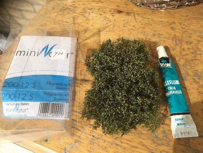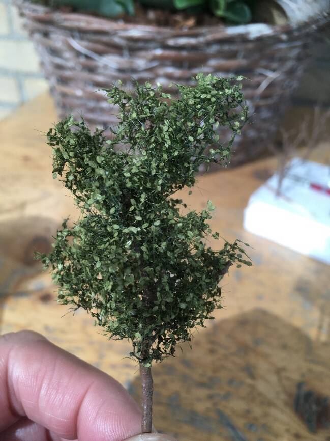 10. De draadboom insmeren hout- of knutsellijm en bestrooid met zand of fijn zaagsel. Na drogen kun je de boompjes beoordelen op dikte en wellicht nog één of meerdere keren insmeren met lijm en bestrooien.